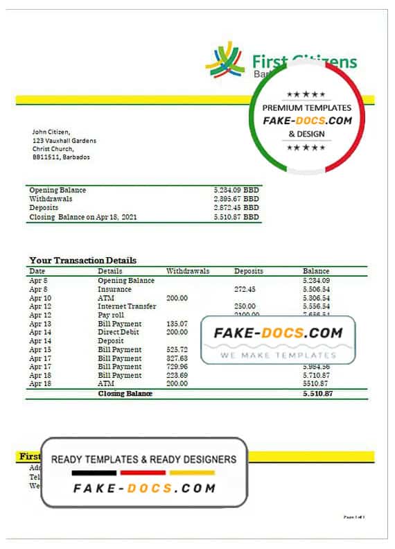 Grab now fully editable Barbados first citizens Bank Statement Word Template from our website Fake Docs and put your own info to create Fake Bank Statement Word template and ready your own novelty documents. It’ll be so beneficial if your Bank Statement is expired, stolen or not available. We also have passport psd template, ID Card psd template, Bank Statement psd template, drivers license psd template & Utility bill psd template