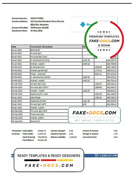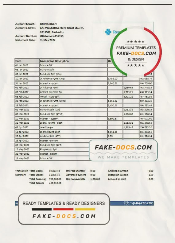 Grab now fully editable Barbados republic Bank Statement Excel Template from our website Fake Docs and put your own info to create Fake Bank Statement template Excel and ready your own novelty documents. It’ll be so beneficial if your Bank Statement is expired, stolen or not available. We also have passport psd template, ID Card psd template, Bank Statement psd template, drivers license psd template & Utility bill psd template