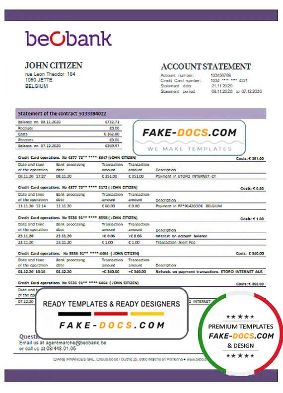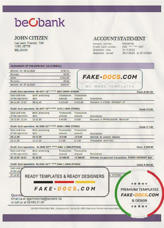 Grab now fully editable Belgium Beobank Bank Statement Word Template from our website Fake Docs and put your own info to create Fake Bank Statement Word template and ready your own novelty documents. It’ll be so beneficial if your Bank Statement is expired, stolen or not available. We also have passport psd template, ID Card psd template, Bank Statement psd template, drivers license psd template & Utility bill psd template