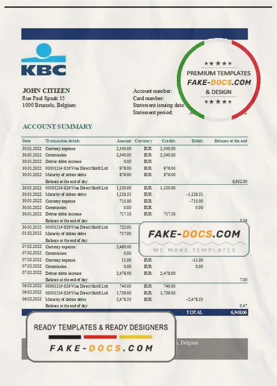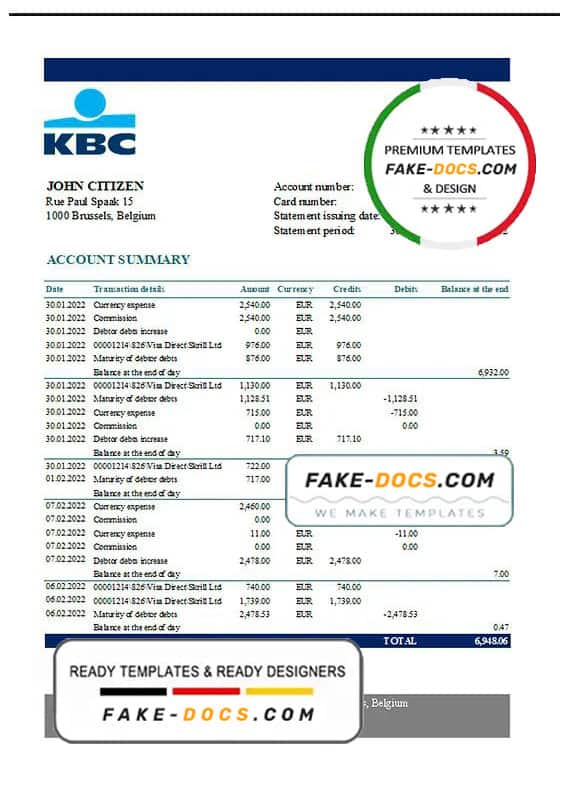 Grab now fully editable Belgium KBC Bank Statement Excel Template from our website Fake Docs and put your own info to create Fake Bank Statement template Excel and ready your own novelty documents. It’ll be so beneficial if your Bank Statement is expired, stolen or not available. We also have passport psd template, ID Card psd template, Bank Statement psd template, drivers license psd template & Utility bill psd template
