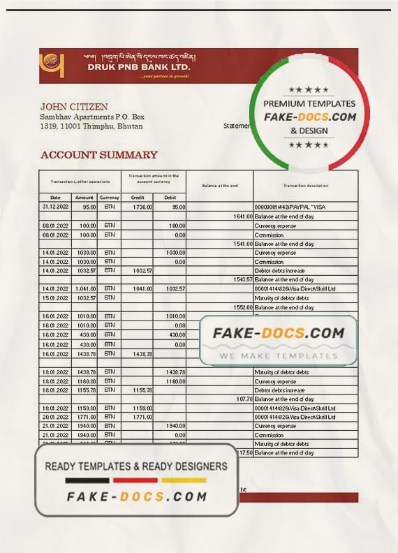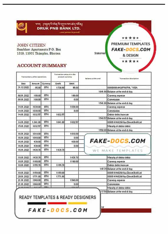 Bhutan Druk PNB bank statement template in Excel and PDF format