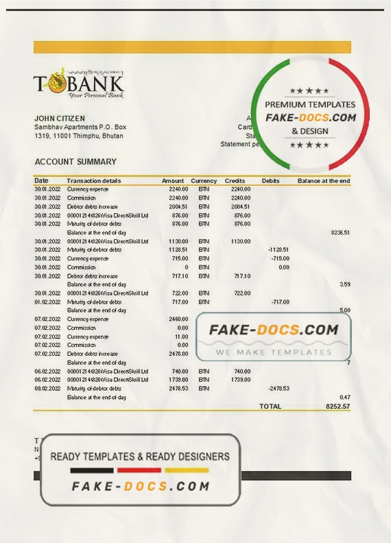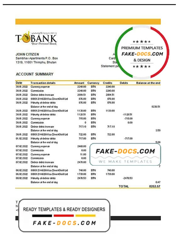 Grab now fully editable Bhutan T Bank Statement Excel Template from our website Fake Docs and put your own info to create Fake Bank Statement template Excel and ready your own novelty documents. It’ll be so beneficial if your Bank Statement is expired, stolen or not available. We also have passport psd template, ID Card psd template, Bank Statement psd template, drivers license psd template & Utility bill psd template