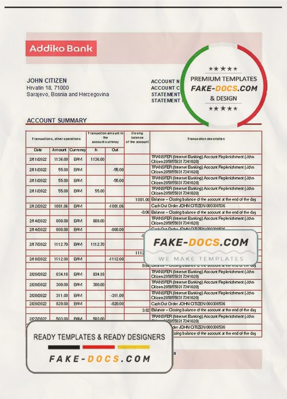 Grab now fully editable Bosnia and Herzegovina Addiko Bank Statement Excel Template from our website Fake Docs and put your own info to create Fake Bank Statement template Excel and ready your own novelty documents. It’ll be so beneficial if your Bank Statement is expired, stolen or not available. We also have passport psd template, ID Card psd template, Bank Statement psd template, drivers license psd template & Utility bill psd template