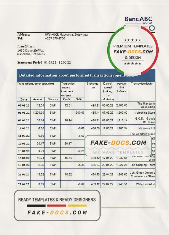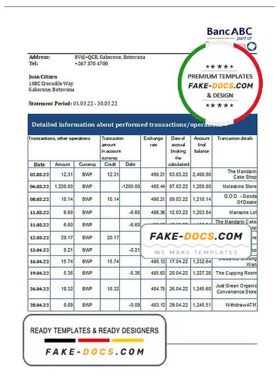 Grab now fully editable Botswana Bank ABC Bank Statement Excel Template from our website Fake Docs and put your own info to create Fake Bank Statement template Excel and ready your own novelty documents. It’ll be so beneficial if your Bank Statement is expired, stolen or not available. We also have passport psd template, ID Card psd template, Bank Statement psd template, drivers license psd template & Utility bill psd template
