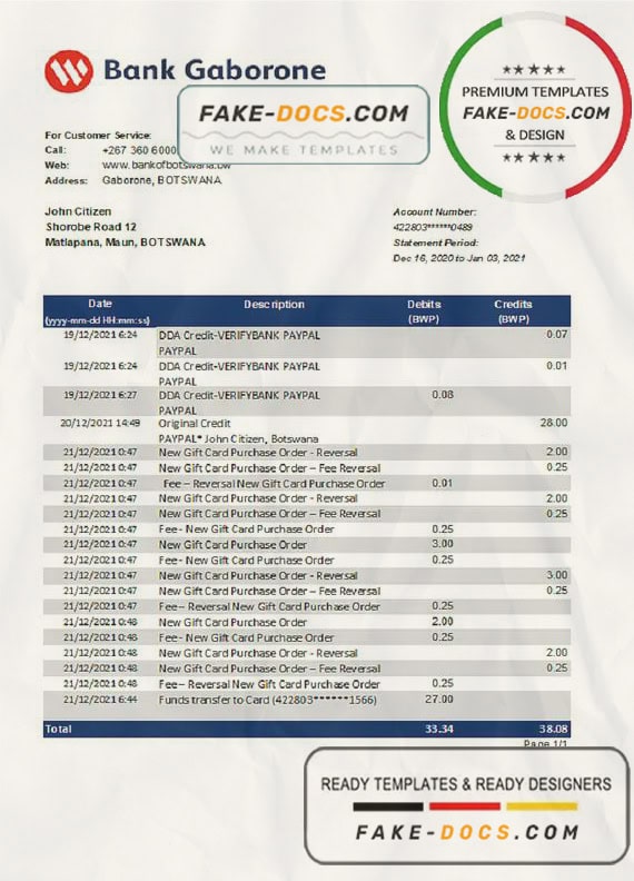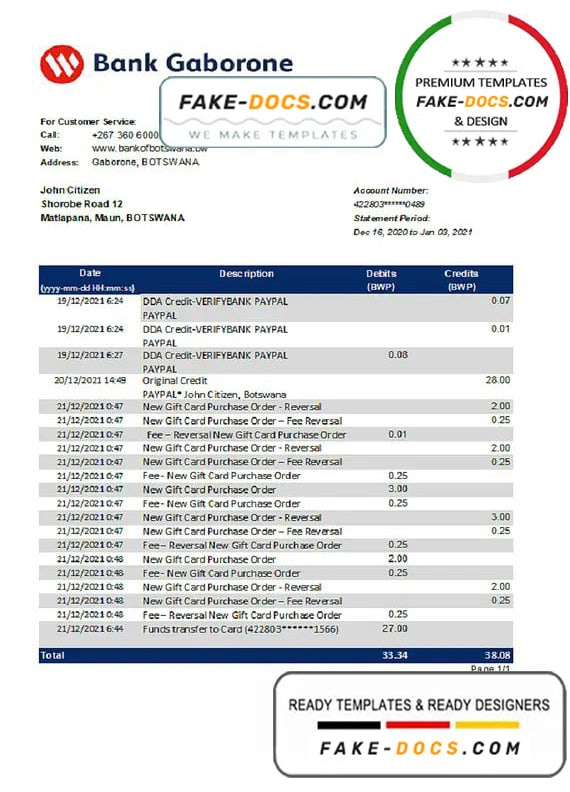 Grab now fully editable Botswana Bank Gaborone Bank Statement Excel Template from our website Fake Docs and put your own info to create Fake Bank Statement template Excel and ready your own novelty documents. It’ll be so beneficial if your Bank Statement is expired, stolen or not available. We also have passport psd template, ID Card psd template, Bank Statement psd template, drivers license psd template & Utility bill psd template