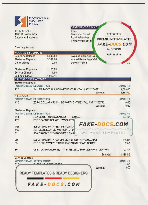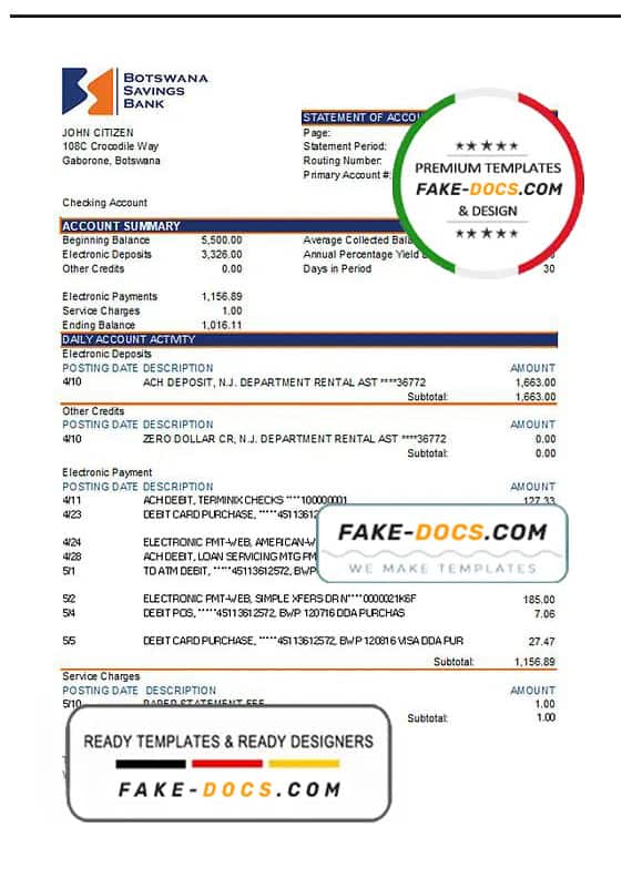 Grab now fully editable Botswana Savings Bank Statement Excel Template from our website Fake Docs and put your own info to create Fake Bank Statement template Excel and ready your own novelty documents. It’ll be so beneficial if your Bank Statement is expired, stolen or not available. We also have passport psd template, ID Card psd template, Bank Statement psd template, drivers license psd template & Utility bill psd template