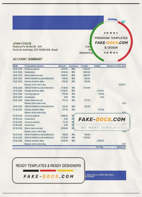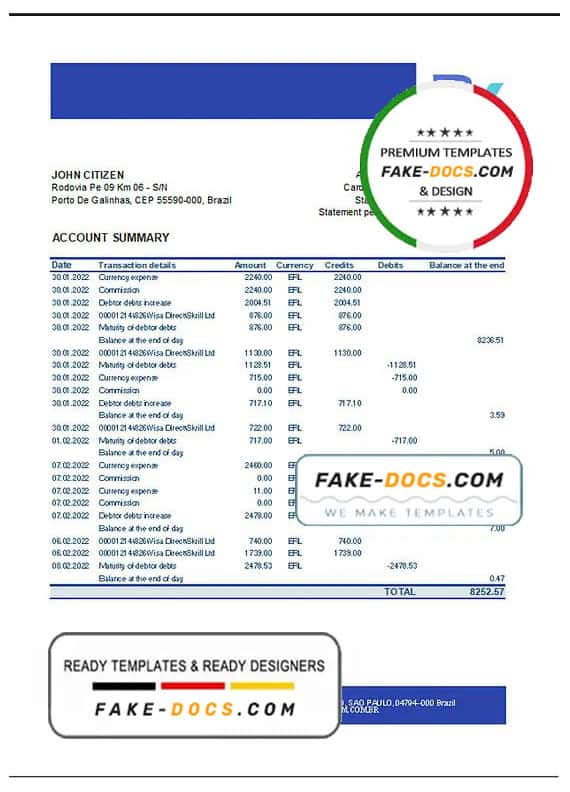 Grab now fully editable Brazil Banco Votorantim Bank Statement Excel Template from our website Fake Docs and put your own info to create Fake Bank Statement template Excel and ready your own novelty documents. It’ll be so beneficial if your Bank Statement is expired, stolen or not available. We also have passport psd template, ID Card psd template, Bank Statement psd template, drivers license psd template & Utility bill psd template