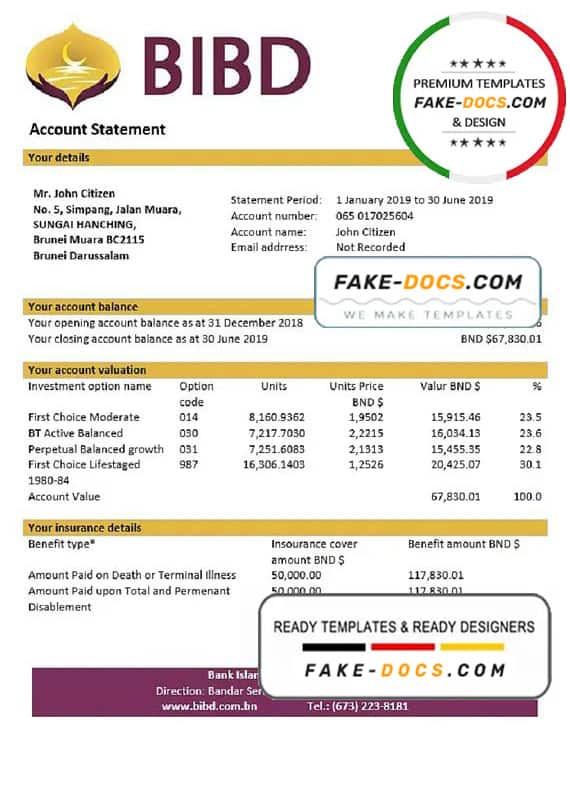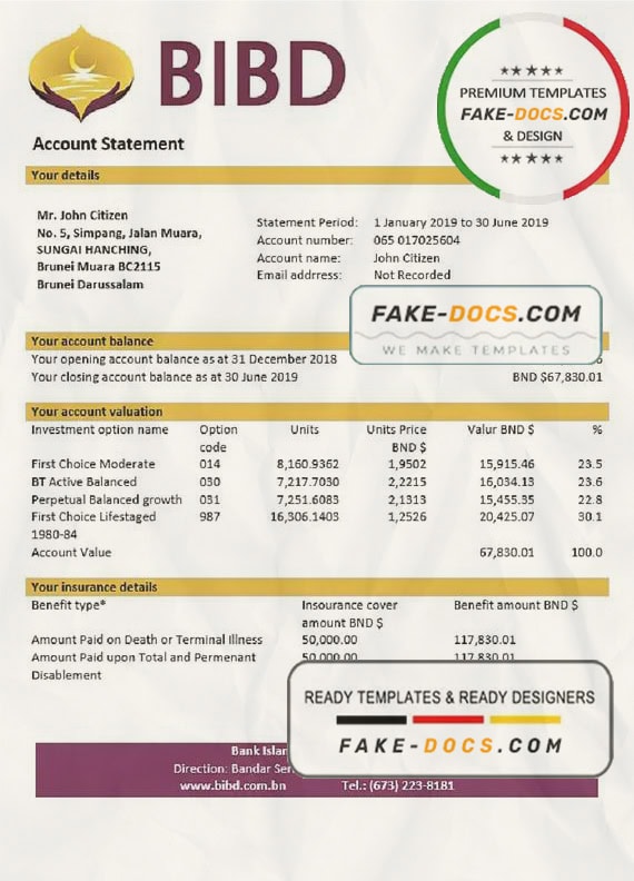 Grab now fully editable Brunei Bank Islam Brunei Darussalam Bank Statement Word Template from our website Fake Docs and put your own info to create Fake Bank Statement Word template and ready your own novelty documents. It’ll be so beneficial if your Bank Statement is expired, stolen or not available. We also have passport psd template, ID Card psd template, Bank Statement psd template, drivers license psd template & Utility bill psd template