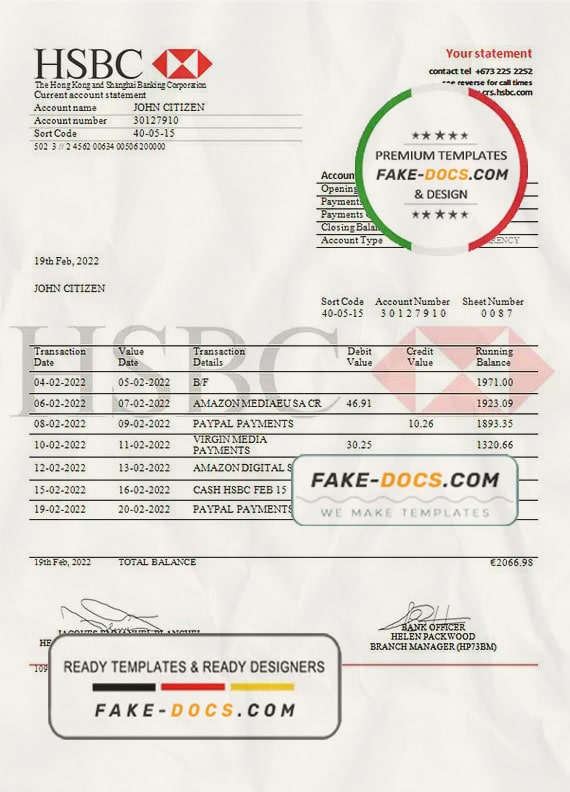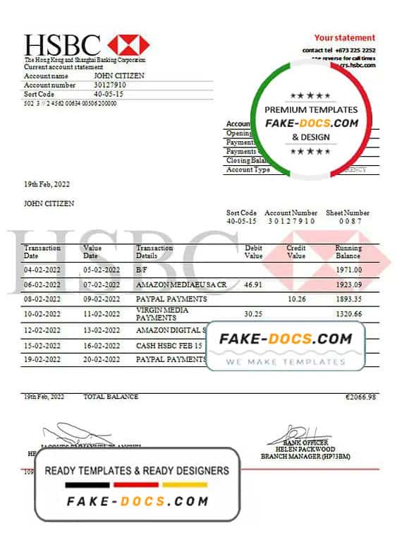 Grab now fully editable Brunei HSBC proof of addres Bank Statement Word Template from our website Fake Docs and put your own info to create Fake Bank Statement Word template and ready your own novelty documents. It’ll be so beneficial if your Bank Statement is expired, stolen or not available. We also have passport psd template, ID Card psd template, Bank Statement psd template, drivers license psd template & Utility bill psd template
