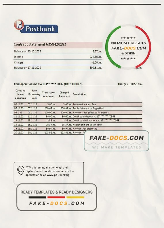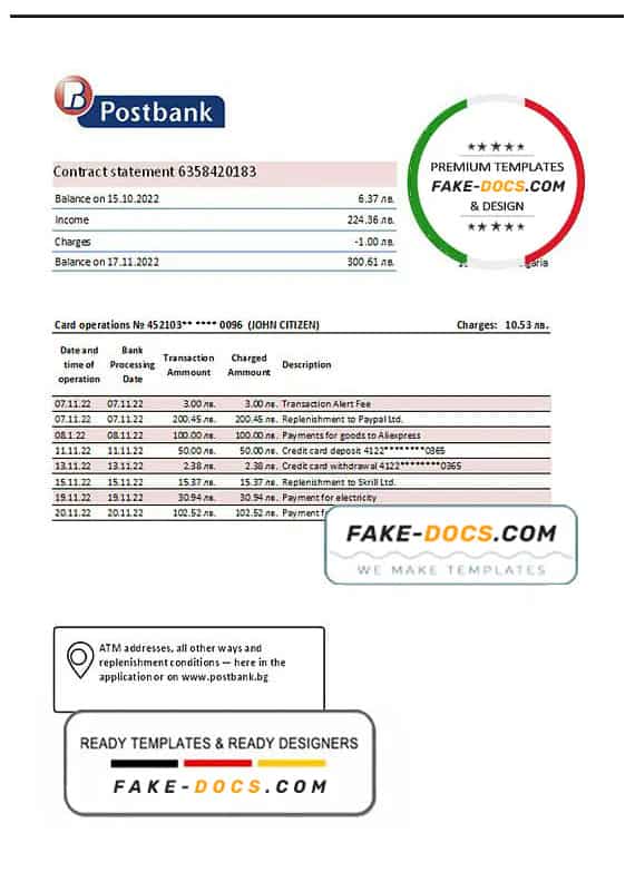 Grab now fully editable Bulgaria Postbank Bank Statement Excel Template from our website Fake Docs and put your own info to create Fake Bank Statement template Excel and ready your own novelty documents. It’ll be so beneficial if your Bank Statement is expired, stolen or not available. We also have passport psd template, ID Card psd template, Bank Statement psd template, drivers license psd template & Utility bill psd template