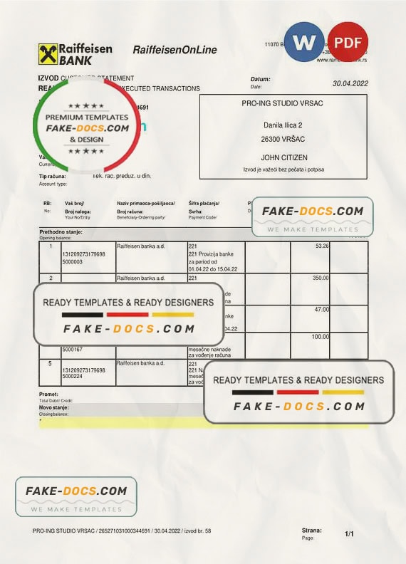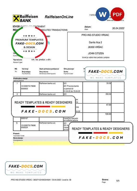 Grab now fully editable Bulgaria Raiffeisen Bank Statement Word Template from our website Fake Docs and put your own info to create Fake Bank Statement Word template and ready your own novelty documents. It’ll be so beneficial if your Bank Statement is expired, stolen or not available. We also have passport psd template, ID Card psd template, Bank Statement psd template, drivers license psd template & Utility bill psd template