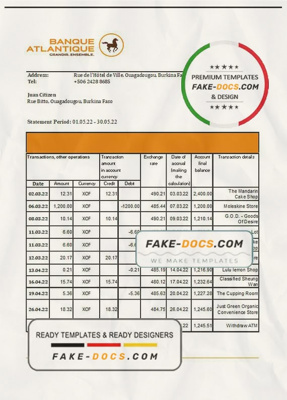 Grab now fully editable Burkina Faso Banque Atlantique Bank Statement Excel Template from our website Fake Docs and put your own info to create Fake Bank Statement template Excel and ready your own novelty documents. It’ll be so beneficial if your Bank Statement is expired, stolen or not available. We also have passport psd template, ID Card psd template, Bank Statement psd template, drivers license psd template & Utility bill psd template