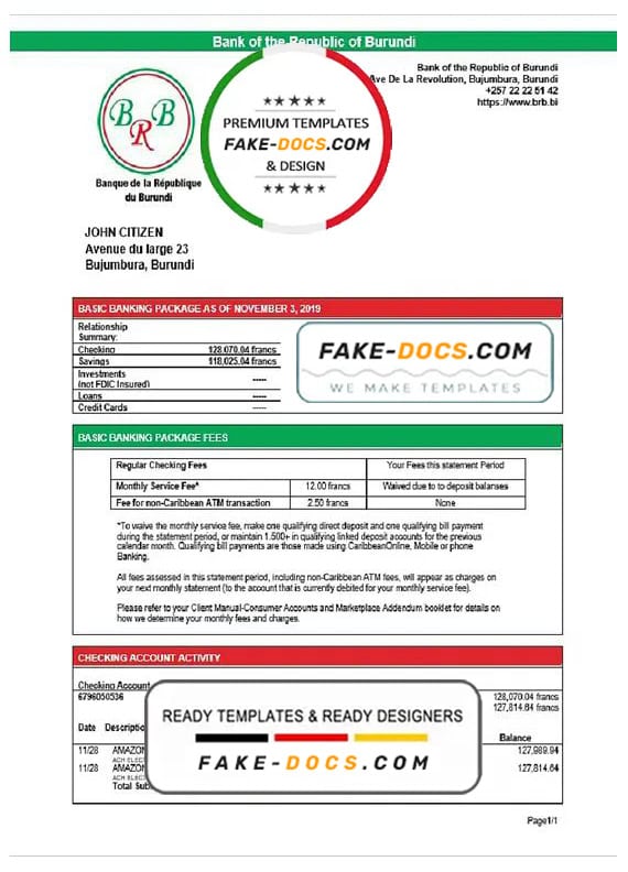 Grab now fully editable Burundi Bank of the Republic of Burundi proof of address Bank Statement Word Template from our website Fake Docs and put your own info to create Fake Bank Statement Word template and ready your own novelty documents. It’ll be so beneficial if your Bank Statement is expired, stolen or not available. We also have passport psd template, ID Card psd template, Bank Statement psd template, drivers license psd template & Utility bill psd template
