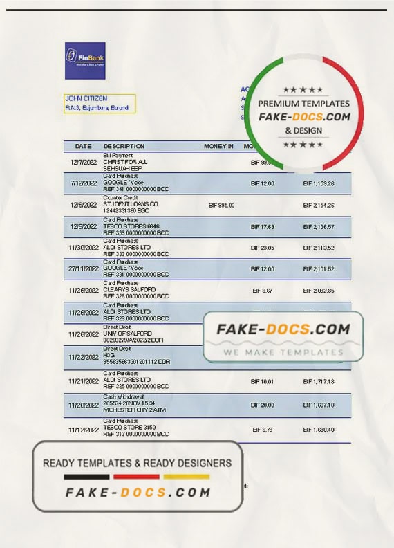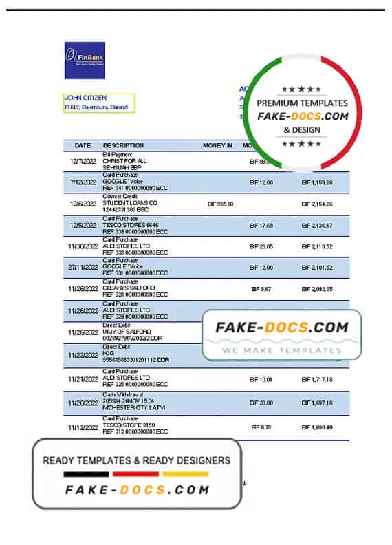 Grab now fully editable Burundi Finbank Bank Statement Excel Template from our website Fake Docs and put your own info to create Fake Bank Statement template Excel and ready your own novelty documents. It’ll be so beneficial if your Bank Statement is expired, stolen or not available. We also have passport psd template, ID Card psd template, Bank Statement psd template, drivers license psd template & Utility bill psd template