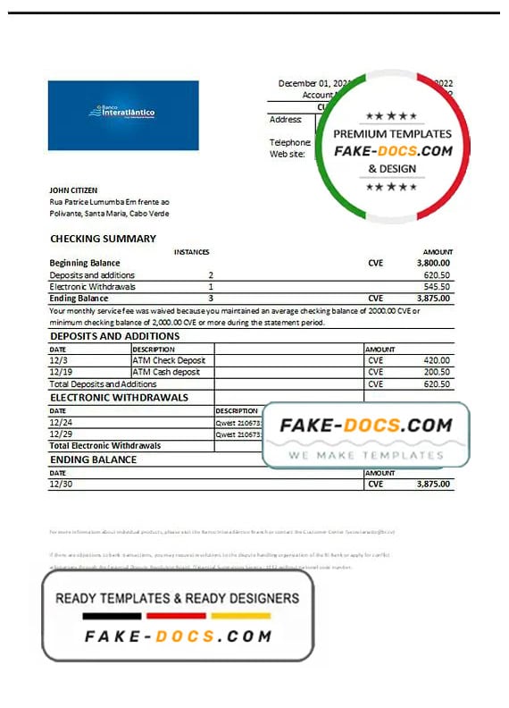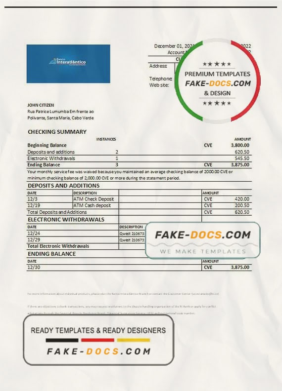 Grab now fully editable Cabo Verde Banco Inter-Atlântico Bank Statement Excel Template from our website Fake Docs and put your own info to create Fake Bank Statement template Excel and ready your own novelty documents. It’ll be so beneficial if your Bank Statement is expired, stolen or not available. We also have passport psd template, ID Card psd template, Bank Statement psd template, drivers license psd template & Utility bill psd template