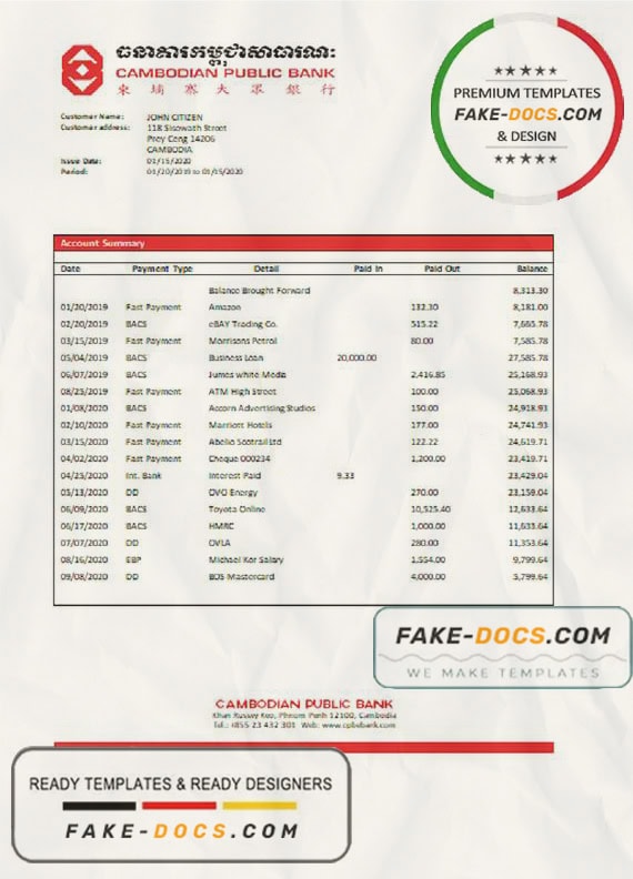 Grab now fully editable Cambodia Cambodian Public Bank Statement Word Template from our website Fake Docs and put your own info to create Fake Bank Statement Word template and ready your own novelty documents. It’ll be so beneficial if your Bank Statement is expired, stolen or not available. We also have passport psd template, ID Card psd template, Bank Statement psd template, drivers license psd template & Utility bill psd template
