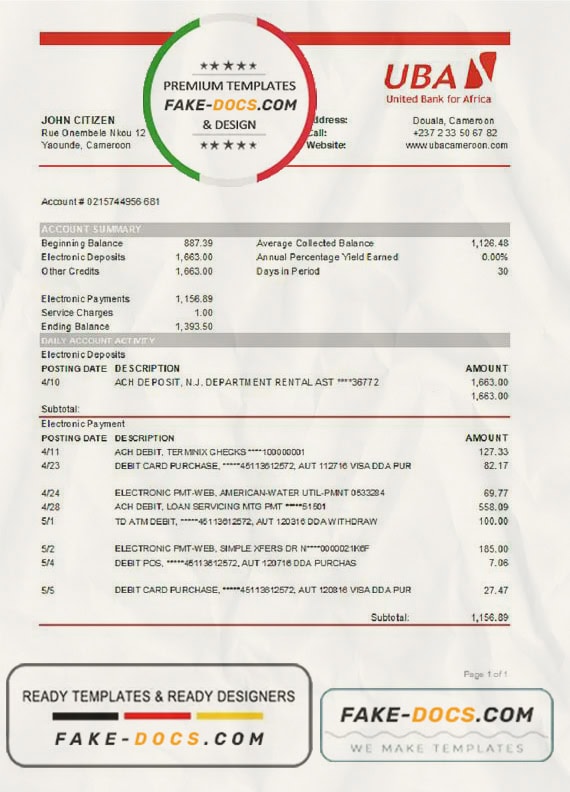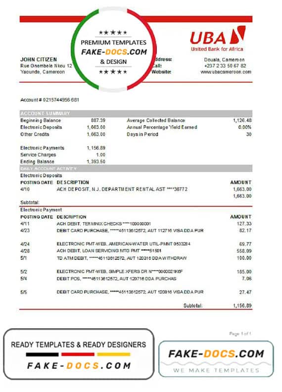 Grab now fully editable Cameroon UBA Bank Statement Excel Template from our website Fake Docs and put your own info to create Fake Bank Statement template Excel and ready your own novelty documents. It’ll be so beneficial if your Bank Statement is expired, stolen or not available. We also have passport psd template, ID Card psd template, Bank Statement psd template, drivers license psd template & Utility bill psd template