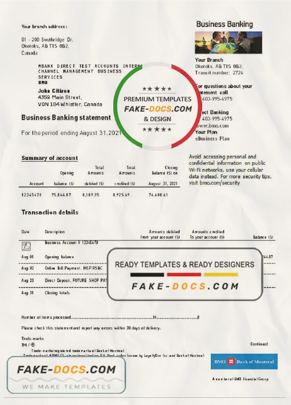 Grab now fully editable Canada BMO Bank of Montreal Bank Statement Word Template from our website Fake Docs and put your own info to create Fake Bank Statement Word template and ready your own novelty documents. It’ll be so beneficial if your Bank Statement is expired, stolen or not available. We also have passport psd template, ID Card psd template, Bank Statement psd template, drivers license psd template & Utility bill psd template