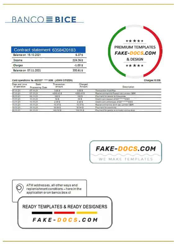 Grab now fully editable Chile Banco Bice Bank Statement Word Template from our website Fake Docs and put your own info to create Fake Bank Statement Word template and ready your own novelty documents. It’ll be so beneficial if your Bank Statement is expired, stolen or not available. We also have passport psd template, ID Card psd template, Bank Statement psd template, drivers license psd template & Utility bill psd template