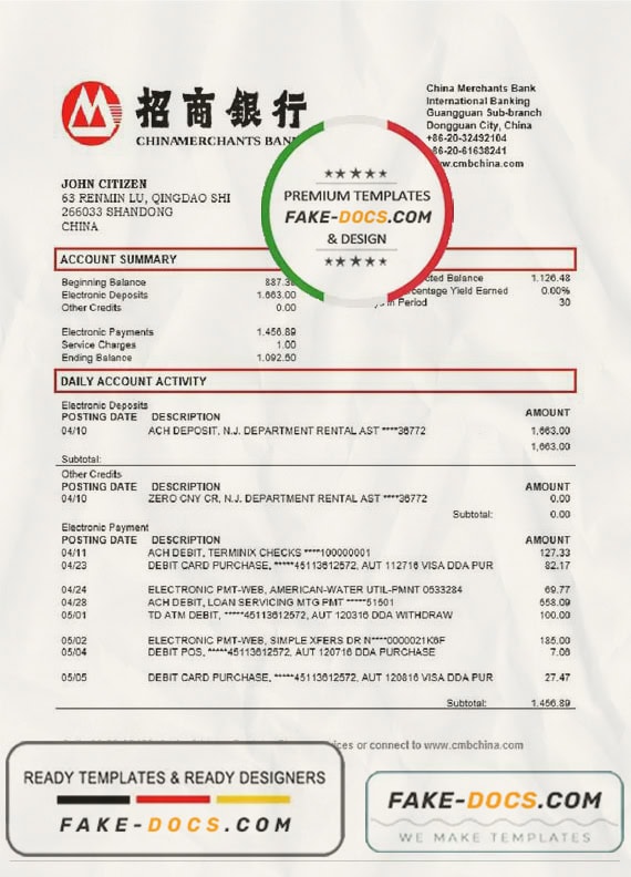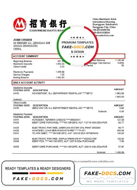 Grab now fully editable China Merchants Bank Statement Word Template from our website Fake Docs and put your own info to create Fake Bank Statement Word template and ready your own novelty documents. It’ll be so beneficial if your Bank Statement is expired, stolen or not available. We also have passport psd template, ID Card psd template, Bank Statement psd template, drivers license psd template & Utility bill psd template