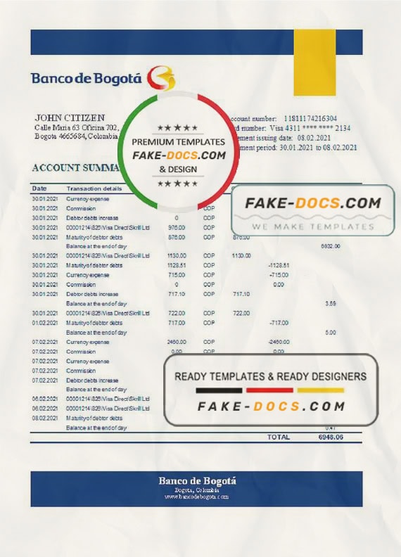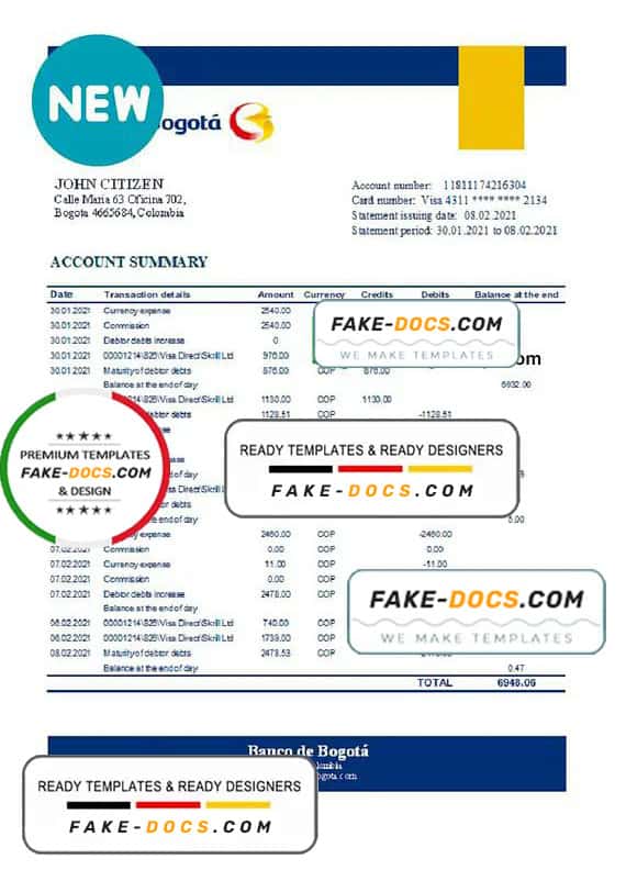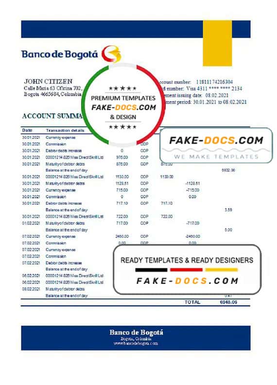 Grab now fully editable Colombia Banco de Bogotá Bank Statement Excel Template from our website Fake Docs and put your own info to create Fake Bank Statement template Excel and ready your own novelty documents. It’ll be so beneficial if your Bank Statement is expired, stolen or not available. We also have passport psd template, ID Card psd template, Bank Statement psd template, drivers license psd template & Utility bill psd template