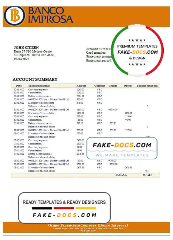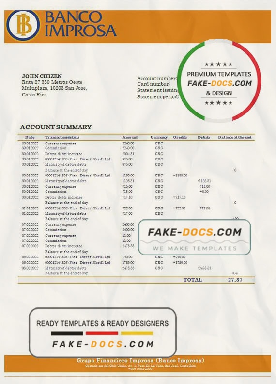 Grab now fully editable Costa Rica Banco Improsa Bank Statement Word Template from our website Fake Docs and put your own info to create Fake Bank Statement Word template and ready your own novelty documents. It’ll be so beneficial if your Bank Statement is expired, stolen or not available. We also have passport psd template, ID Card psd template, Bank Statement psd template, drivers license psd template & Utility bill psd template