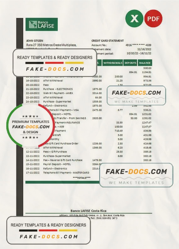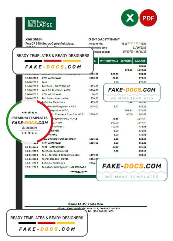 Grab now fully editable Costa Rica Banco Lafise Bank Statement Excel Template from our website Fake Docs and put your own info to create Fake Bank Statement template Excel and ready your own novelty documents. It’ll be so beneficial if your Bank Statement is expired, stolen or not available. We also have passport psd template, ID Card psd template, Bank Statement psd template, drivers license psd template & Utility bill psd template