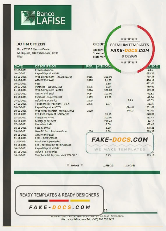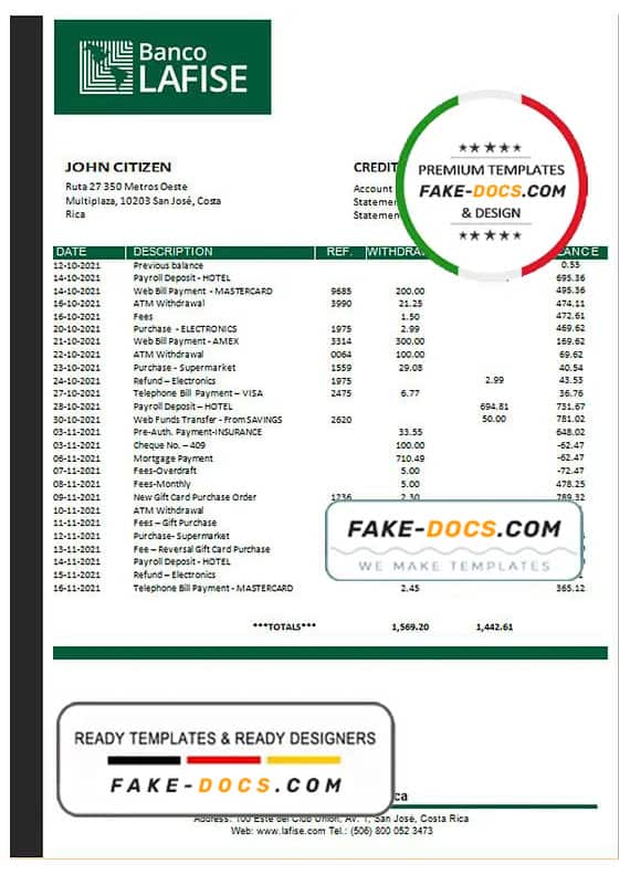 Grab now fully editable Costa Rica Banco Lafise Bank Statement Word Template from our website Fake Docs and put your own info to create Fake Bank Statement Word template and ready your own novelty documents. It’ll be so beneficial if your Bank Statement is expired, stolen or not available. We also have passport psd template, ID Card psd template, Bank Statement psd template, drivers license psd template & Utility bill psd template