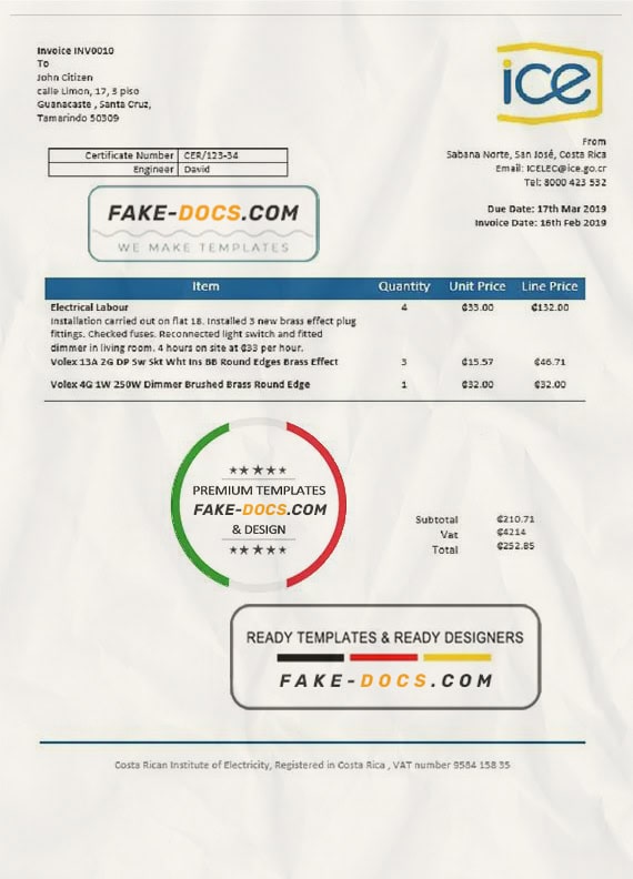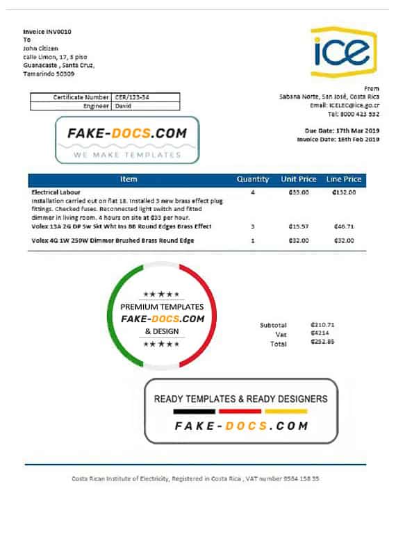 Costa Rica Costa Rican Institute of Electricity utility bill Word template . Fully editable Word template. High quality template. Easy to customize, Layer based, fonts included. you can edit this template and put any name, address, license number, Id number, birth date, height, weight, expire date etc. This Word template is a easy to Editing.To modify this Word template file you will need a Word editing software such as Microsoft Word. Never used low quality template. Your account may be suspended.