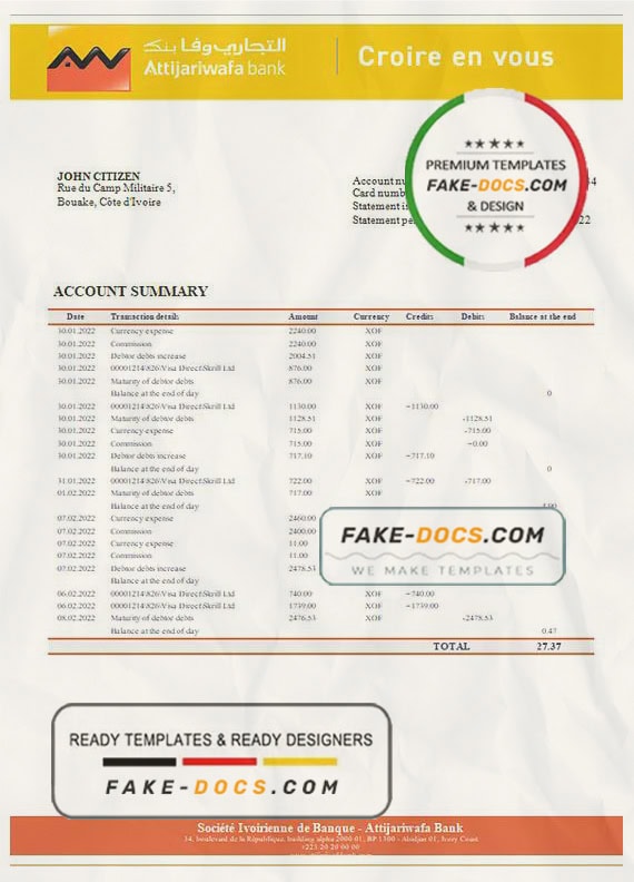 Grab now fully editable Cote d’Ivoire Attijariwafa Bank Statement Word Template from our website Fake Docs and put your own info to create Fake Bank Statement Word template and ready your own novelty documents. It’ll be so beneficial if your Bank Statement is expired, stolen or not available. We also have passport psd template, ID Card psd template, Bank Statement psd template, drivers license psd template & Utility bill psd template