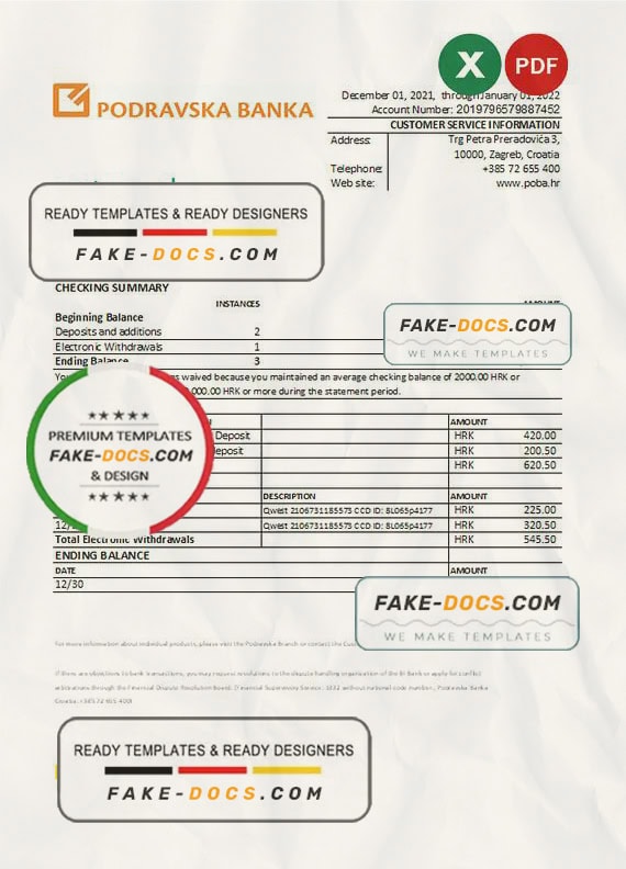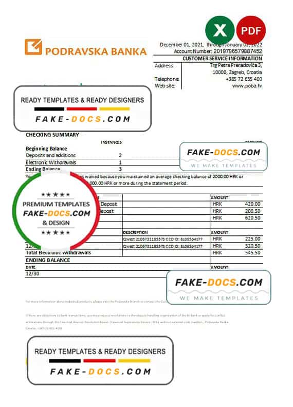 Grab now fully editable Croatia Podravska Bank Statement Excel Template from our website Fake Docs and put your own info to create Fake Bank Statement template Excel and ready your own novelty documents. It’ll be so beneficial if your Bank Statement is expired, stolen or not available. We also have passport psd template, ID Card psd template, Bank Statement psd template, drivers license psd template & Utility bill psd template