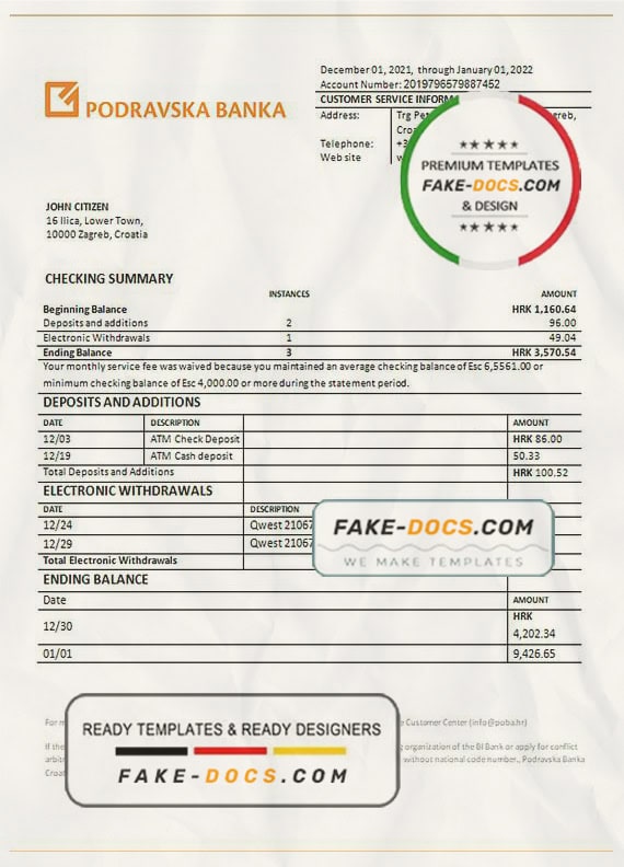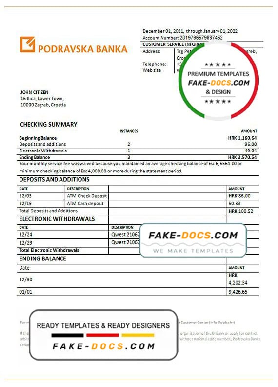 Grab now fully editable Croatia Podravska Bank Statement Word Template from our website Fake Docs and put your own info to create Fake Bank Statement Word template and ready your own novelty documents. It’ll be so beneficial if your Bank Statement is expired, stolen or not available. We also have passport psd template, ID Card psd template, Bank Statement psd template, drivers license psd template & Utility bill psd template