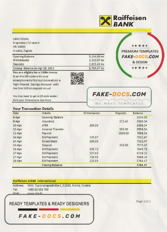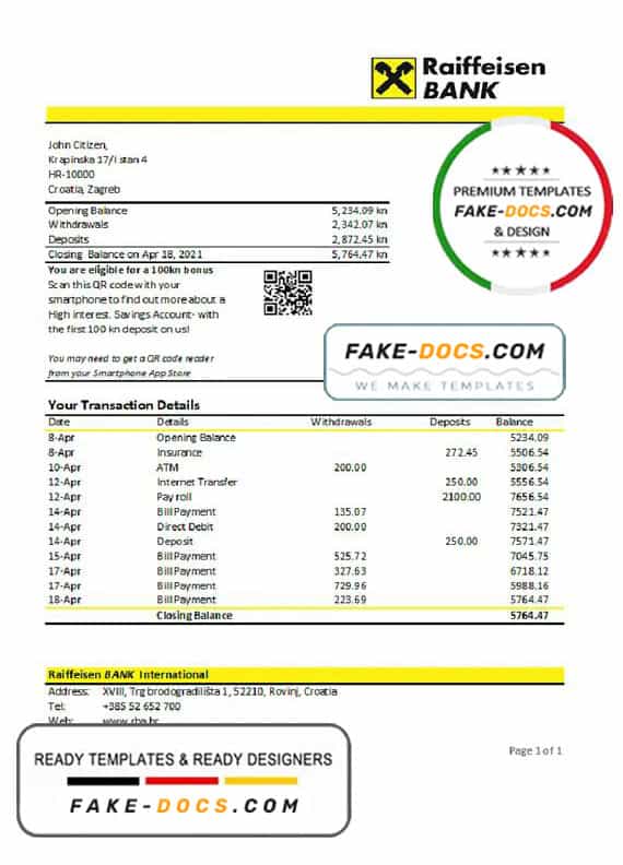 Grab now fully editable Croatia Raiffeisen Bank Statement Excel Template from our website Fake Docs and put your own info to create Fake Bank Statement template Excel and ready your own novelty documents. It’ll be so beneficial if your Bank Statement is expired, stolen or not available. We also have passport psd template, ID Card psd template, Bank Statement psd template, drivers license psd template & Utility bill psd template