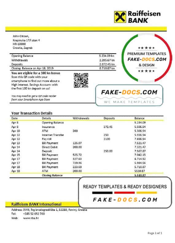 Grab now fully editable Croatia Raiffeisen Bank Statement Word Template from our website Fake Docs and put your own info to create Fake Bank Statement Word template and ready your own novelty documents. It’ll be so beneficial if your Bank Statement is expired, stolen or not available. We also have passport psd template, ID Card psd template, Bank Statement psd template, drivers license psd template & Utility bill psd template