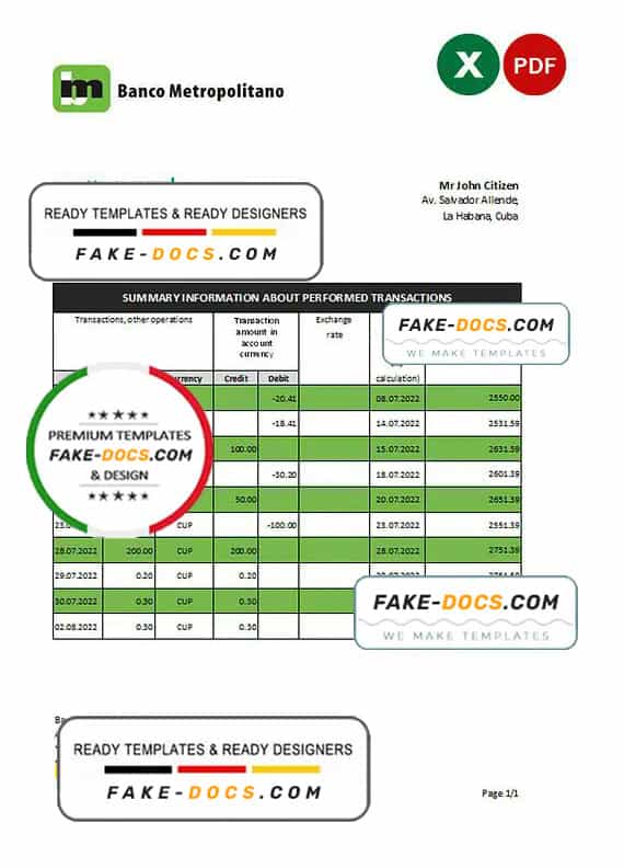 Grab now fully editable Cuba Banco Metropolitano Bank Statement Excel Template from our website Fake Docs and put your own info to create Fake Bank Statement template Excel and ready your own novelty documents. It’ll be so beneficial if your Bank Statement is expired, stolen or not available. We also have passport psd template, ID Card psd template, Bank Statement psd template, drivers license psd template & Utility bill psd template