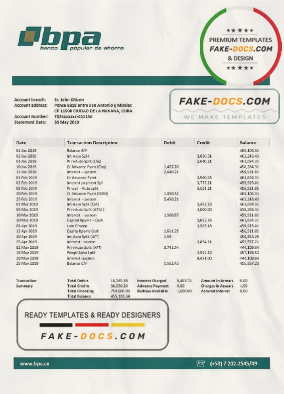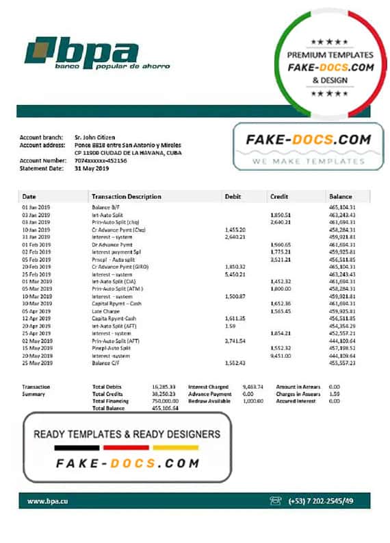 Grab now fully editable Cuba Banco Popular de Ahorro (BPA) Bank Statement Word Template from our website Fake Docs and put your own info to create Fake Bank Statement Word template and ready your own novelty documents. It’ll be so beneficial if your Bank Statement is expired, stolen or not available. We also have passport psd template, ID Card psd template, Bank Statement psd template, drivers license psd template & Utility bill psd template