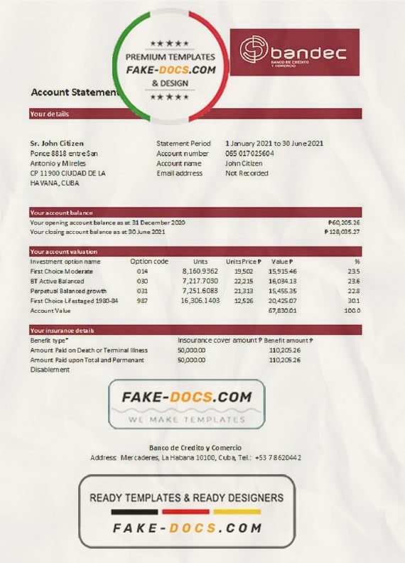 Grab now fully editable Cuba Bandec Banco de Credito y Comercio Bank Statement Excel Template from our website Fake Docs and put your own info to create Fake Bank Statement template Excel and ready your own novelty documents. It’ll be so beneficial if your Bank Statement is expired, stolen or not available. We also have passport psd template, ID Card psd template, Bank Statement psd template, drivers license psd template & Utility bill psd template