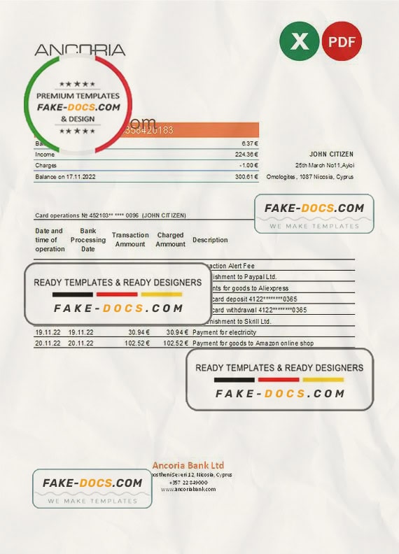 Grab now fully editable Cyprus Ancoria Bank Statement Excel Template from our website Fake Docs and put your own info to create Fake Bank Statement template Excel and ready your own novelty documents. It’ll be so beneficial if your Bank Statement is expired, stolen or not available. We also have passport psd template, ID Card psd template, Bank Statement psd template, drivers license psd template & Utility bill psd template