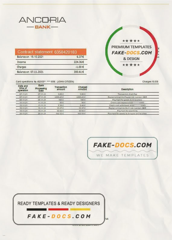 Grab now fully editable Cyprus Ancoria Bank Statement Word Template from our website Fake Docs and put your own info to create Fake Bank Statement Word template and ready your own novelty documents. It’ll be so beneficial if your Bank Statement is expired, stolen or not available. We also have passport psd template, ID Card psd template, Bank Statement psd template, drivers license psd template & Utility bill psd template