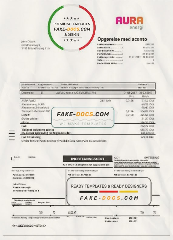 Denmark AURA Energi utility bill Word template . Fully editable Word template. High quality template. Easy to customize, Layer based, fonts included. you can edit this template and put any name, address, license number, Id number, birth date, height, weight, expire date etc. This Word template is a easy to Editing.To modify this Word template file you will need a Word editing software such as Microsoft Word. Never used low quality template. Your account may be suspended.