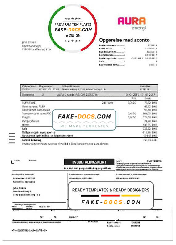 Grab now fully editable Denmark AURA Energi utility bill Template from our website fake docs and put your own info to create a fake copy of Fake Denmark AURA Energi Utility Bill for proof of address and ready your own novelty documents. It’ll be so beneficial if your utility bill is expired, stolen or not available. We also have passport psd template, ID Card psd template, Bank Statement psd template, drivers license psd template & Utility bill psd template
