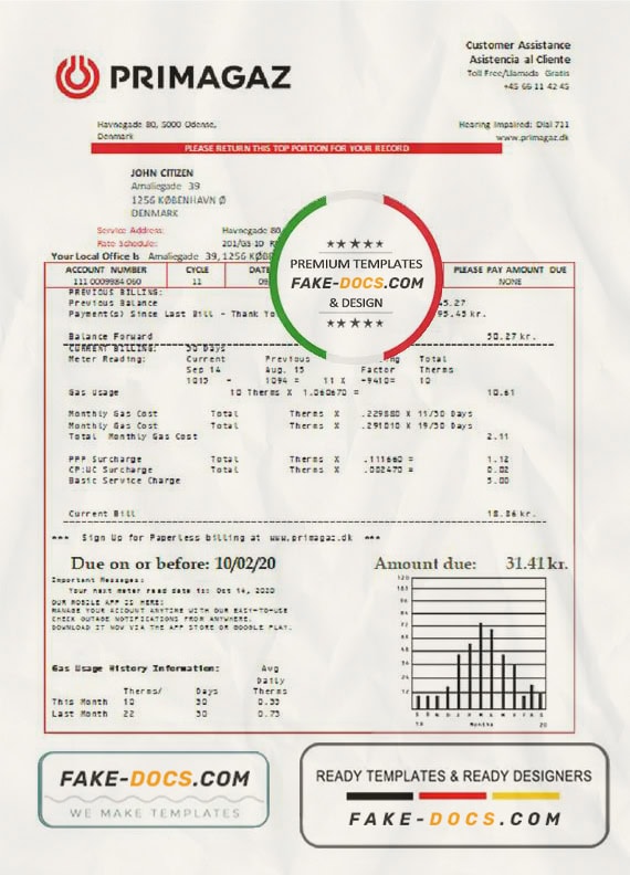 Grab now fully editable Denmark Primagaz Denmark gas utility bill Template from our website fake docs and put your own info to create a fake copy of Fake Denmark Primagaz Denmark gas Utility Bill for proof of address and ready your own novelty documents. It’ll be so beneficial if your utility bill is expired, stolen or not available. We also have passport psd template, ID Card psd template, Bank Statement psd template, drivers license psd template & Utility bill psd template