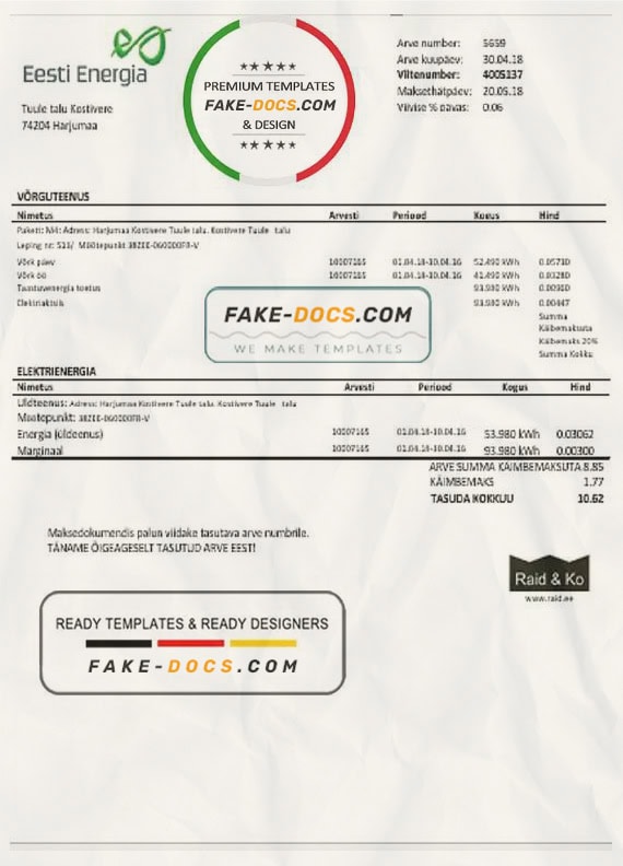 Grab now fully editable Estonia Eesti Energia electricity utility bill Template from our website fake docs and put your own info to create a fake copy of Fake Estonia Eesti Energia electricity Utility Bill for proof of address and ready your own novelty documents. It’ll be so beneficial if your utility bill is expired, stolen or not available. We also have passport psd template, ID Card psd template, Bank Statement psd template, drivers license psd template & Utility bill psd template