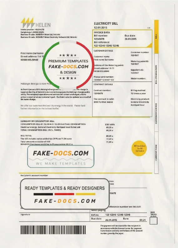 Finland HELEN utility bill Word template . Fully editable Word template. High quality template. Easy to customize, Layer based, fonts included. you can edit this template and put any name, address, license number, Id number, birth date, height, weight, expire date etc. This Word template is a easy to Editing.To modify this Word template file you will need a Word editing software such as Microsoft Word. Never used low quality template. Your account may be suspended.