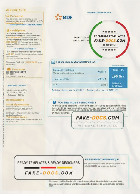Grab now fully editable France electricity EDF utility bill Template from our website fake docs and put your own info to create a fake copy of Fake France electricity EDF Utility Bill for proof of address and ready your own novelty documents. It’ll be so beneficial if your utility bill is expired, stolen or not available. We also have passport psd template, ID Card psd template, Bank Statement psd template, drivers license psd template & Utility bill psd template