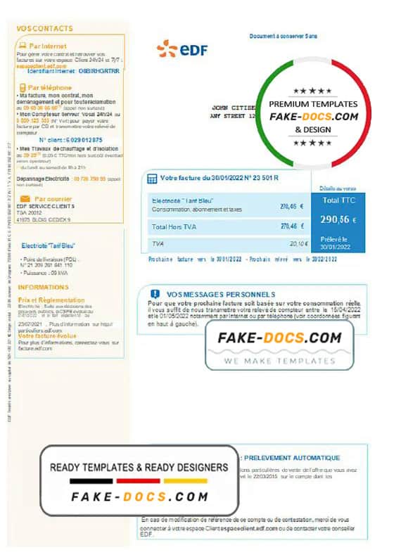 France electricity EDF utility bill Word template . Fully editable Word template. High quality template. Easy to customize, Layer based, fonts included. you can edit this template and put any name, address, license number, Id number, birth date, height, weight, expire date etc. This Word template is a easy to Editing.To modify this Word template file you will need a Word editing software such as Microsoft Word. Never used low quality template. Your account may be suspended.