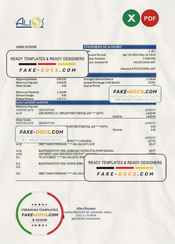 Grab now fully editable Gabon Alios Finance Bank Statement Excel Template from our website Fake Docs and put your own info to create Fake Bank Statement template Excel and ready your own novelty documents. It’ll be so beneficial if your Bank Statement is expired, stolen or not available. We also have passport psd template, ID Card psd template, Bank Statement psd template, drivers license psd template & Utility bill psd template