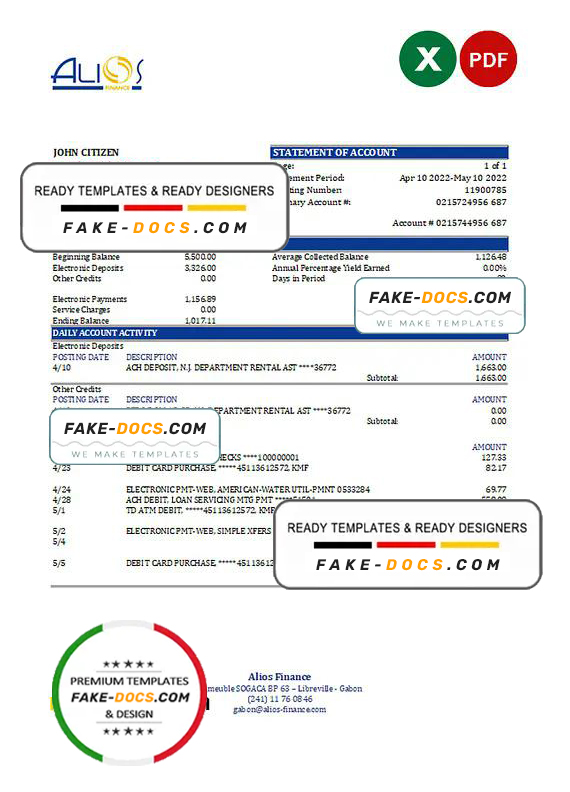 Gabon Alios Finance Bank Statement template Excel. Fully editable Excel template. High quality template. Easy to customize, fonts included. you can edit this template and put any name, address, license number, Id number, birth date, height, weight, expire date, change photos etc. This Excel template is a easy to Editing.To modify this Excel template file you will need a Excel editing software such as Microsoft Excel. Never used low quality template. Your account may be suspended.