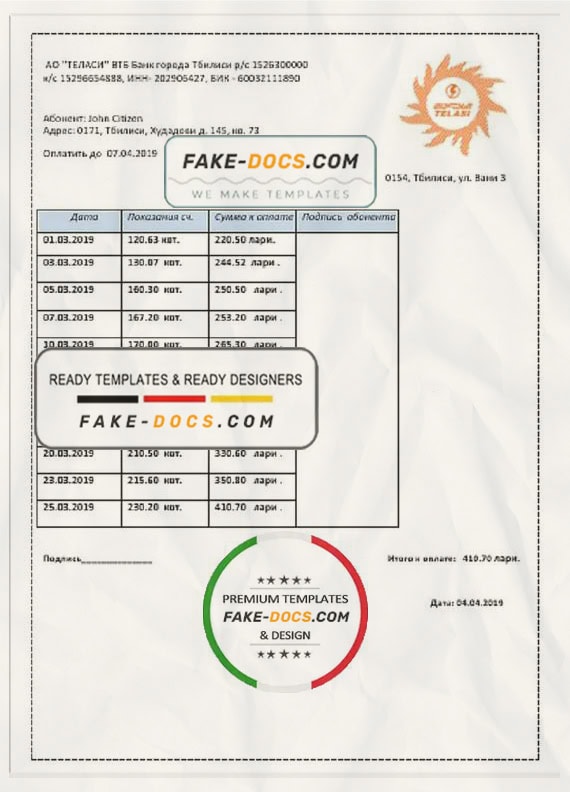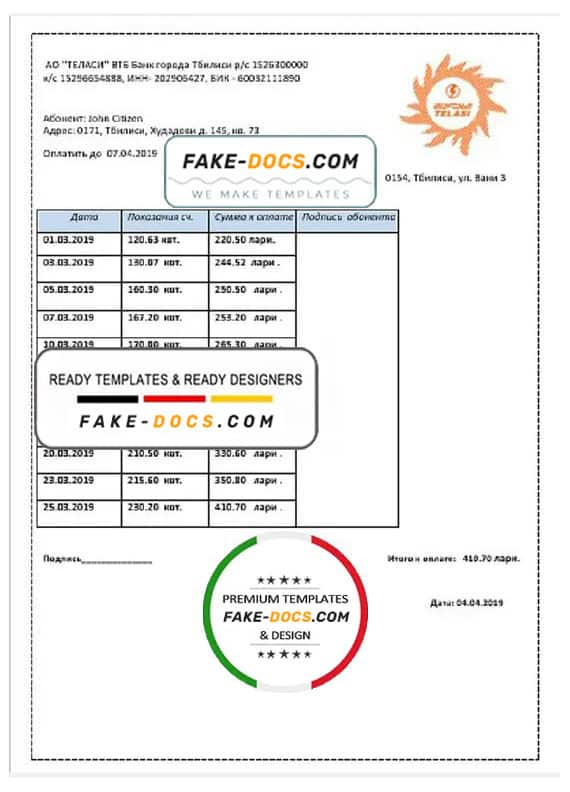 Grab now fully editable Georgia Telasi utility bill Template from our website fake docs and put your own info to create a fake copy of Fake Georgia Telasi Utility Bill for proof of address and ready your own novelty documents. It’ll be so beneficial if your utility bill is expired, stolen or not available. We also have passport psd template, ID Card psd template, Bank Statement psd template, drivers license psd template & Utility bill psd template