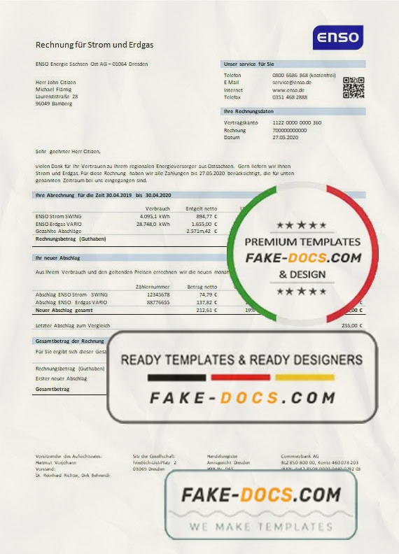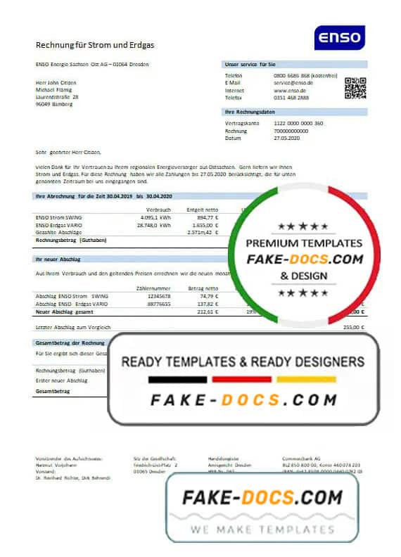 Grab now fully editable Germany ENSO rechnung für strom und erdgas utility bill Template from our website fake docs and put your own info to create a fake copy of Fake Germany ENSO rechnung für strom und erdgas Utility Bill for proof of address and ready your own novelty documents. It’ll be so beneficial if your utility bill is expired, stolen or not available. We also have passport psd template, ID Card psd template, Bank Statement psd template, drivers license psd template & Utility bill psd template